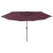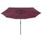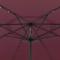 Parasol de jardin avec lumières LED mât en métal rouge bordeauxCe parasol de jardin tendance avec des lumières LED est une excellente solution pour créer de l'ombre et vous protéger des rayons UV nocifs. Ce parasol est fabriqué en polyester qui vous offre une protection optimale contre les coups de soleil. Le mât en métal fort, ainsi que les baleines rigides, maintiennent le parasol stable et robuste. Il dispose de 32 LED pour éclairer et créer une ambiance chaleureuse et romantique la nuit. En outre, il peut également être ouvert et fermé facilement grâce au mécanisme à manivelle. Tenir les enfants à l'écart de la zone d'assemblage pendant le montage. Manipulez les pièces lourdes avec précaution. Assurez-vous que ce produit est entièrement assemblé comme illustré avant de l'utiliser. Ce produit ne doit être utilisé que sur un sol ferme et plat. Veillez à ce que le produit soit toujours placé sur un sol plat. Aucune responsabilité ne sera acceptée en cas de dommages ou de blessures causés par une utilisation incorrecte de ce produit. Tenir les mains à l'écart du mécanisme de pliage et des pièces mobiles afin d'éviter tout risque de blessure. N'utilisez ni n'ouvrez jamais ce parasol sans qu'une base appropriée ne soit en place. N'utilisez pas ce parasol pendant les périodes de vent fort et de pluie. Le non-respect de cette consigne peut entraîner des blessures et/ou des dommages. Fermez toujours le parasol et mettez la housse si le vent dépasse une « brise modérée », s'il y a des chutes de neige ou s'il pleut. Le produit contient de petites pièces qui peuvent présenter un risque pour les jeunes enfants. Gardez les petites pièces hors de portée des enfants. Ce produit n'est pas un jouet ! Veillez à ce que les enfants n'utilisent pas le parasol, l'auvent ou la base pour jouer, grimper, jouer ou grimper. N'utilisez pas de feu ouvert (par exemple, barbecue ou grill) sous ou à côté de ce produit.