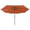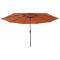Parasol de jardin avec lumières LED et mât en métal terre cuiteCe parasol de jardin tendance avec des lumières LED est une excellente solution pour créer de l'ombre et vous protéger des rayons UV nocifs. Ce parasol est fabriqué en polyester qui vous offre une protection optimale contre les coups de soleil. Le mât en métal fort, ainsi que les baleines rigides, maintiennent le parasol stable et robuste. Il dispose de 32 LED pour éclairer et créer une ambiance chaleureuse et romantique la nuit. En outre, il peut également être ouvert et fermé facilement grâce au mécanisme à manivelle. Tenir les enfants à l'écart de la zone d'assemblage pendant le montage. Manipulez les pièces lourdes avec précaution. Assurez-vous que ce produit est entièrement assemblé comme illustré avant de l'utiliser. Ce produit ne doit être utilisé que sur un sol ferme et plat. Veillez à ce que le produit soit toujours placé sur un sol plat. Aucune responsabilité ne sera acceptée en cas de dommages ou de blessures causés par une utilisation incorrecte de ce produit. Tenir les mains à l'écart du mécanisme de pliage et des pièces mobiles afin d'éviter tout risque de blessure. N'utilisez ni n'ouvrez jamais ce parasol sans qu'une base appropriée ne soit en place. N'utilisez pas ce parasol pendant les périodes de vent fort et de pluie. Le non-respect de cette consigne peut entraîner des blessures et/ou des dommages. Fermez toujours le parasol et mettez la housse si le vent dépasse une « brise modérée », s'il y a des chutes de neige ou s'il pleut. Le produit contient de petites pièces qui peuvent présenter un risque pour les jeunes enfants. Gardez les petites pièces hors de portée des enfants. Ce produit n'est pas un jouet ! Veillez à ce que les enfants n'utilisent pas le parasol, l'auvent ou la base pour jouer, grimper, jouer ou grimper. N'utilisez pas de feu ouvert (par exemple, barbecue ou grill) sous ou à côté de ce produit.