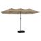 Parasol de jardin à double tête avec LED taupe 449x245 cmCet élégant parasol de jardin à deux têtes avec LED est un choix parfait pour créer de l'ombre et vous protéger des rayons UV nocifs. Matériau durable : fabriqué en polyester anti-UV et anti-décoloration, le parasol de jardin vous offre une protection optimale contre le soleil et est facile à nettoyer.Cadre robuste : le solide mât en fer enduit de poudre, ainsi que les nervures durables, rendent le parasol de jardin très stable et robuste.Lumières LED brillantes : les lumières LED intégrées du parasol illuminent votre espace de vie extérieur et créent une ambiance chaleureuse et romantique lorsque le soleil se couche.Mécanisme à manivelle : grâce au mécanisme de la manivelle, le parasol s'ouvre et se ferme facilement.Base solide : la base avec le sac à sable assure la solidité et la stabilité du parasol, même en cas de vent fort ou de forte pluie. Il est important que tout produit assemblé à l'aide d'une vis, quelle qu'elle soit, soit resserré deux semaines après l'assemblage et une fois tous les trois mois, afin d'assurer la stabilité du produit pendant toute sa durée de vie. Ne serrez pas complètement chaque vis avant que toutes les vis soient correctement fixées. Tenir les enfants à l'écart de la zone d'assemblage pendant le montage. Manipulez les pièces lourdes avec précaution. Assurez-vous que ce produit est entièrement assemblé comme illustré avant de l'utiliser. Ce produit ne doit être utilisé que sur un sol ferme et plat. Veillez à ce que le produit soit toujours placé sur un sol plat. Aucune responsabilité ne sera acceptée en cas de dommages ou de blessures causés par une utilisation incorrecte de ce produit. Tenir les mains à l'écart du mécanisme de pliage et des pièces mobiles afin d'éviter tout risque de blessure. N'utilisez ni n'ouvrez jamais ce parasol sans qu'une base appropriée ne soit en place. N'utilisez pas ce parasol pendant les périodes de vent fort et de pluie. Le non-respect de cette consigne peut entraîner des blessures et/ou des dommages. Fermez toujours le parasol et mettez la housse si le vent dépasse une « brise modérée », s'il y a des chutes de neige ou s'il pleut. Le produit contient de petites pièces qui peuvent présenter un risque pour les jeunes enfants. Gardez les petites pièces hors de portée des enfants. Ce produit n'est pas un jouet ! Veillez à ce que les enfants n'utilisent pas le parasol, l'auvent ou la base pour jouer ou grimper. pour jouer ou grimper. N'utilisez pas de feu ouvert (par exemple, barbecue ou grill) sous ou à côté de ce produit. Si la vitesse du vent dépasse 6 m/s ou en cas de fortes pluies, retirez soigneusement le produit, pliez-le, sécurisez-le et mettez-le dans un endroit sûr. Si le tissu devient accidentellement mouillé, séchez-le immédiatement pour éviter un vieillissement prématuré du produit. Vérifiez avant utilisation que votre gazebo, tente, parasol ou pavillon n'est pas endommagé (éléments métalliques pliés, tissu déchiré). En cas de dommages, n'utilisez pas le produit. Le non-respect de ces consignes peut entraîner des dommages.