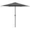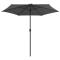 Parasol de jardin et mât en aluminium 270x246 cm AnthraciteCe parasol d'extérieur est parfait pour créer de l'ombre et vous protéger des rayons UV nocifs. Fabriquée en polyester anti-UV et anti-décoloration, la couverture de parasol vous offre une protection optimale contre le soleil et est facile à nettoyer. Le poteau en aluminium et les 6 robustes nervures en acier, rendent le parasol très stable et durable. Le parasol de jardin peut être ouvert et fermé facilement grâce au mécanisme à manivelle. L'article est facile à assembler. Veuillez noter que nous vous recommandons de traiter le tissu du parasol avec un spray imperméabilisant s'il est soumis à des fortes précipitations. Il est important que tout produit assemblé à l'aide d'une vis, quelle qu'elle soit, soit resserré deux semaines après l'assemblage et une fois tous les trois mois, afin d'assurer la stabilité du produit pendant toute sa durée de vie. Tenez les enfants à l'écart de la zone d'assemblage pendant l'assemblage. Manipulez les pièces lourdes avec précaution. Assurez-vous que ce produit est entièrement assemblé comme illustré avant de l'utiliser. Ce produit ne doit être utilisé que sur un sol ferme et plat. Tenir les mains à l'écart du mécanisme de pliage et des pièces mobiles afin d'éviter tout risque de blessure. N'utilisez ni n'ouvrez jamais ce parasol sans qu'une base appropriée ne soit en place. N'utilisez pas ce parasol en cas de vents violents ou de pluie. Le non-respect de cette consigne peut entraîner des blessures et/ou des dommages. Fermez toujours le parasol et mettez la housse si le vent dépasse une « brise modérée », s'il y a des chutes de neige ou s'il pleut. Le produit contient de petites pièces qui peuvent présenter un risque pour les jeunes enfants. Gardez les petites pièces hors de portée des enfants. Ce produit n'est pas un jouet ! Veillez à ce que les enfants n'utilisent pas le parasol, l'auvent ou la base pour jouer ou grimper. N'utilisez pas de feu ouvert (par exemple, barbecue ou grill) sous ou à côté de ce produit.