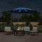 Parasol de jardin en porte-à-faux et lumières LED mât en acierCet élégant parasol suspendu avec lumières LED est parfait pour créer de l'ombre et vous protéger des rayons UV nocifs. Fabriquée en polyester anti-UV et anti-décoloration, la toile de parasol vous offre une protection optimale contre le soleil et est facile à nettoyer. Le parasol dispose de 24 LED à énergie solaire pour éclairer automatiquement votre espace de vie extérieure et créer une ambiance chaleureuse et romantique quand le soleil se couche. Il est également livré avec une base croisée robuste pour une stabilité accrue. Le design exclusif de ce parasol vous permet d'incliner le parasol pour cacher le soleil alors qu'il se dirige vers l'horizon. Le mât en acier résistant, ainsi que les 8 nervures durables, rendent le parasol très stable et durable. Notre parasol de jardin peut être ouvert et fermé facilement grâce au mécanisme à manivelle. L'article est facile à assembler. Veuillez noter que nous vous recommandons de traiter le tissu du parasol avec un spray imperméabilisant s'il est soumis à des fortes précipitations. Il est important que tout produit assemblé à l'aide d'une vis, quelle qu'elle soit, soit resserré deux semaines après l'assemblage et une fois tous les trois mois, afin d'assurer la stabilité du produit pendant toute sa durée de vie. Ne serrez pas complètement chaque vis avant que toutes les vis soient correctement fixées. Tenir les enfants à l'écart de la zone d'assemblage pendant le montage. Manipulez les pièces lourdes avec précaution. Assurez-vous que ce produit est entièrement assemblé comme illustré avant de l'utiliser. Ce produit ne doit être utilisé que sur un sol ferme et plat. Veillez à ce que le produit soit toujours placé sur un sol plat. Aucune responsabilité ne sera acceptée en cas de dommages ou de blessures causés par une utilisation incorrecte de ce produit. Tenir les mains à l'écart du mécanisme de pliage et des pièces mobiles afin d'éviter tout risque de blessure. N'utilisez ni n'ouvrez jamais ce parasol sans qu'une base appropriée ne soit en place. N'utilisez pas ce parasol pendant les périodes de vent fort et de pluie. Le non-respect de cette consigne peut entraîner des blessures et/ou des dommages. Fermez toujours le parasol et mettez la housse si le vent dépasse une « brise modérée », s'il y a des chutes de neige ou s'il pleut. Le produit contient de petites pièces qui peuvent présenter un risque pour les jeunes enfants. Gardez les petites pièces hors de portée des enfants. Ce produit n'est pas un jouet ! Veillez à ce que les enfants n'utilisent pas le parasol, l'auvent ou la base pour jouer ou grimper. pour jouer ou grimper. N'utilisez pas de feu ouvert (par exemple, barbecue ou grill) sous ou à côté de ce produit. Si la vitesse du vent dépasse 6 m/s ou en cas de fortes pluies, retirez soigneusement le produit, pliez-le, sécurisez-le et mettez-le dans un endroit sûr. Si le tissu devient accidentellement mouillé, séchez-le immédiatement pour éviter un vieillissement prématuré du produit. Vérifiez avant utilisation que votre gazebo, tente, parasol ou pavillon n'est pas endommagé (éléments métalliques pliés, tissu déchiré). En cas de dommages, n'utilisez pas le produit. Le non-respect de ces consignes peut entraîner des dommages.
