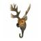 Patère murale artisanale en forme de tête de cerf, finement sculptée et peinte à la main, équipée d'un crochet en métal de couleur bronze.