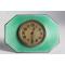 Pendulette de voyage en argent et émail guilloché vert poinçons Silver Sterling mouvement mécanique 8 jours bon état, infime défaut à l'émail en bas à droite, voir photos mouvement à réviser, ne fonctionne pas