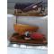 Présentoir "Les Couteaux de Pierrot" en noyer avec meule de bois de chevreuil et support bois et peau pour maintenir la pochette dans le passant. Dessous en croûte de peau avec tampons feutrine.