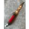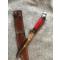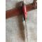 l'ensemble est vraiment en bon état ; quelques très très minimes traces d'oxydation sur la partie de la lame ( elle- meme en très bon état ) se situant entre les plaquettes : celles-ci sont , me semble-t-il en ,Bakélite rouge ( pas de fêle ni de rayures ) ainsi , toujours me semble-t-il , et en cuir ( ?).