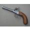 Petit pistolet à percussion à balle forcée (le canon se dévisse pour le chargement) de fabrication allemande, période 1830 à 1870. C'est un pistolet de jarretière, aissi nommé parce qu'il était porté par les dames de petite vertue pour assurer leur sécurité ou pistolet de voyage, pour les hommes ou les femmes qui voulaient pallier les mauvaises rencontres. Il est particulièrement intéressant par ses nombreux marquages, rarement rencontrés de manière aussi précise et détaillée :