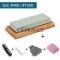 Face bleue grains épais/moyens #800 : elle peut avoir plusieurs fonctions. Premièrement, elle permet d'affiner un peu le tranchant travaillé avec la première face, qui va seulement le dégrossir mais ne va pas lui donner une excellente qualité de coupe. Ainsi, cette deuxième phase permet d'aiguiser votre couteau de façon plus poussé. Sur certaines lames peu dures (HRC inférieur à 55), elle peut même servir de pierre régulière, pour maintenir le tranchant (rien ne servira de monter trop haut dans les grains puisque ce genre d'alliage n'est pas fait pour tenir un tranchant trop marqué durablement). Enfin, elle peut aussi servir d'étape intermédiaire pour l'aiguisage de couteaux durs. Vous pourrez donc passer par ce grain, puis vous diriger vers #1000, puis #3000 etc.