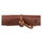 Pochette en cuir marron et lanières fait main, logo Helle gravé.