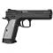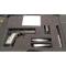 Le pistolet est équipé de poignées plates en duralumin anodisé argent, de mires en métal massif et de sécurités manuelles plates et ambidextres.