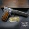 Son numéro de série précoce, 1XX, clairement visible, confirme une fabrication en 1900. Ce numéro est également frappé sur les deux parties de la carcasse, attestant d’un ensemble matching, un critère essentiel pour les collectionneurs d’armes historiques. Les marquages d’adresse et de brevet Colt, situés de part et d’autre du canon, sont bien visibles, avec une légère usure sur les zones de frottement. Le logo du poulain, finement gravé, demeure parfaitement identifiable. Les plaquettes en bois, en excellent état, correspondent au modèle et sont parfaitement ajustées.