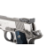 Ce modèle se distingue par son quadrillage 25 LPI sur la bande avant et arrière, garantissant une excellente prise en main. Son puits de chargeur biseauté facilite les rechargements rapides, tandis que la visée arrière réglable permet un alignement optimal pour des tirs précis. Il est également équipé de poignées Colt bleu compétition en G10, offrant un excellent grip et une esthétique unique.