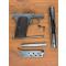 Détente simple action, canon fixe de 10 cm, guidon dérivable, sûreté de poignée, chargeur de 7 coups.