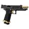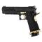 Fonctionnement : Gaz Blowback Diamètre canon interne : 6,01 mm Longueur du canon interne : 114 mm Longueur totale : 180,5 mm Poids : 1 KG Vitesse initiale : 300 - 330 FPS (mesurer avec des billes de 0,20 g) Hop-Up réglable Capacité du chargeur : 28 billes Magazine compatible avec Tokyo Marui, WE-Tech et d'autres magazines Hi-Capa 5.1 similaires Couleur : Noir / Or Compatible avec la plupart des pièces Tokyo Marui Hi-Capa Glissière légère en aluminium CNC avec un cadre en polymère moulé par injection offrant un compromis parfait entre légèreté et robustesse Mires en fibre optique Poignée de pistolet texturée qui offre une excellente prise en main Levier de sécurité ambidextre avec une queue de castor de sécurité à prise fonctionnelle Rail picatinny inférieur intégré pour lampes, lasers Magwell Gold