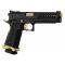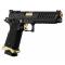 Fonctionnement : Gaz Blowback Hop-Up réglable Magazine compatible avec Tokyo Marui, WE-Tech et d'autres magazines Hi-Capa 5.1 similaires Stippling fait main Diamètre canon interne : 6,01 mm Longueur du canon interne : 114 mm Longueur totale : 180,5 mm Poids : 1 KG Vitesse initiale : 300 - 330 FPS (mesurer avec des billes de 0,20 g) Capacité du chargeur : 28 billes Couleur : Noir / Or Compatible avec la plupart des pièces Tokyo Marui Hi-Capa Glissière légère en aluminium CNC avec un cadre en polymère moulé par injection offrant un compromis parfait entre légèreté et robustesse Mires en fibre optique Poignée de pistolet texturée qui offre une excellente prise en main Levier de sécurité ambidextre avec une queue de castor de sécurité à prise fonctionnelle Rail picatinny inférieur intégré pour lampes, lasers Magwell Gold ¨