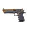 Découvrez le Desert Eagle Black & Gold de Magnum Research, une arme de poing emblématique au design bicolore saisissant. Doté d'un canon de 6 pouces en titane doré et d'une glissière en acier carbone noir mat, ce pistolet allie esthétisme et robustesse. Avec un calibre de 44 REM MAG et une capacité de 8+1 coups, il est conçu pour offrir une puissance de tir exceptionnelle. Son châssis en aluminium noir mat et sa poignée ergonomique en caoutchouc Hogue® garantissent une prise en main confortable et sécurisée.