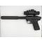 Mondification silencieuse faite dans nos ateliers sur la fameuse mécanique RUGER 22/45.l'equivalent de deux silencieux mis bout a bout pour obtenir un niveau d'atténuation hors norme. Livré avec rail picatiny et point rouge bushnell RXS 250.