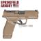 Le Springfield Armory Hellcat Pro OSP, en calibre 9x19 mm avec un canon de 4,4 pouces, est un pistolet compact doté d'une finition FDE (Flat Dark Earth).