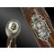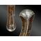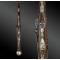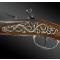 Monture en noyer veiné, sculptée, décorée de fils d’argent et d’une pièce de pouce représentant un profil romain flanqué de deux guirlandes et surmonté d’une couronne. Baguette en bois.