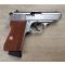 Le pistolet Walther modèle PPK/S en calibre .22 LR, ici en finition nickel, est une déclinaison moderne du célèbre PPK, conçue pour améliorer ergonomie et conformité réglementaire, notamment sur le marché américain.