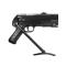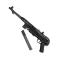 Crosse rabattable, chargeur amovible, détente et levier d'armement mobiles.