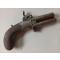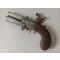 Pistolet à percussion anglais à canons rotatifs. Signé « Gameson ». Canons rotatifs superposés, rayés, avec percuteur. Boîtier gravé de feuillages, signé « Gameson » et doté d'une détente escamotable. Coq gravé de motifs marins et sécurité à l'arrière. Poignée en noyer strié. Pièce pour le pouce en argent. Longueur : 18 cm, longueur du canon : 7,7 cm. Vers 1830. Très bon état. Autres photos et informations sur demande.
