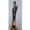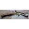 Monture noyer niellée de laiton avec pièce de pouce figurant une feuille de palmier et dattes, numérotée 134, poignées gravées, sculptées et quadrillées, platine à silex col de cygne avec poincon DN (couronné ?) partiellement et volontairement effacé anciennement, contre-platine laiton avec tringle et anneau de selle en métal, forte plaque de couche enveloppante en laiton, canon tromblonné à la bouche avec chiffres et lettres frappés (134 KC), baguette bois, portes baguette laiton.