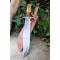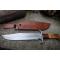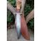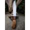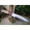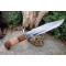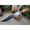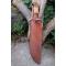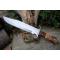 Couteau de chasse Bushcraft Survie à lame fixe - Longueur totale 38cm - Longueur de lame 24.5cm - Lame en acier carbone 1055 - Lame type clip point plain edge - Construction d'une seule pièce - Full tang - Plaquettes du manche en 3 bois - Grosse garde en acier - Etui cuir - Fabrication artisanale