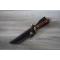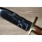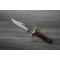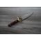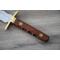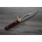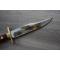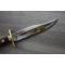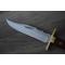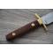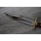 Couteau bowie ancien, vintage, lame polie miroir avec marquage très léger : Bowie Knife - William Rodgers Sheffield England, double garde large, garnitures laiton, montage plate semelle avec plaquettes en bois rivetées, étui de ceinture en cuir. Ensemble en très bon état de collection, voir photos descriptives. Longueur Totale 26,2cm - Longeur Lame 14,6cm - Epaisseur 4mm