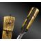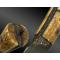 La poignée à quatre plaquettes en ivoire marin, rivetées et garnies de fleurs en argent. Le sommet est muni d’un ergot. Reste de damasquine d’or.