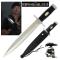 Livré dans un solide fourreau en cuir noir cousu avec un passant de ceinture, une fermeture à bouton-pression qui passe sur la garde pour sécuriser l'arme et un cordon en nylon noir pour le fixer à la jambe (44 cm de long et 120 g), ce couteau de combat fabriqué à la main est indispensable aux fans de Stallone et aux amateurs de poignards équilibrés et fonctionnels à la finition parfaite.