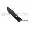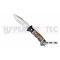 La lame est arrondie à l'avant, ce qui réduit le risque de blessure. Les écailles de la poignée rivetée sont en bois de ronce, les mitres et le pommeau sont en ébène. Incrustations métalliques décoratives.