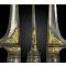 Lame droite à un tranchant en acier damassé, dos plat, avec au talon une damasquine d'or de rinceaux et de larges fleurs épanouies.