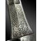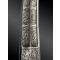 Lame courbe à deux gouttières et arête centrale, entièrement gravée d’écritures arabe sur chaque côté. Le talon est gravé de motifs floraux et d’oiseaux avec au centre un cartouche niellé. La poignée est en fer argenté.