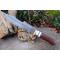 Longueur du manche 13cm - Longueur de la lame 23cm - Tranchant de 19.5cm - Lame en Acier damas 256 couches - Lame de type clip point Recurve - Garde en laiton - Manche en bois - Entretoises en résine - Fabrication Artisanale - Les dessins de la lame sont uniques comme une empreinte - Etui cuir
