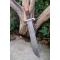 Longueur du manche 13.5cm - Longueur de la lame 25cm - Tranchant de 23.5cm - Lame en Acier damas 256 couches - Construction d'une seule pièce - Full tang - Lame de type drop point - Garde en nickel - Manche en 2 bois - Fabrication Artisanale - Les dessins de la lame sont uniques comme une empreinte - Etui cuir