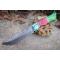 Longueur du manche 13cm - Longueur de la lame 17cm - Tranchant de 17cm - Lame en Acier damas 256 couches - Construction d'une seule pièce - Full tang - Lame de type drop point - Dents sur le haut de la lame pour allume feu - Manche en bois - Mitres en résine - Fabrication Artisanale - Les dessins de la lame sont uniques comme une empreinte - Etui cuir