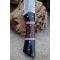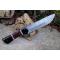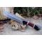 Longueur du manche 13.5cm - Longueur de la lame 17cm - Tranchant de 16cm - Lame en Acier damas 256 couches - Construction d'une seule pièce - Full tang - Lame de type drop point - Plaquettes du manche en bois - Entretoises en résine - Trou dans le manche pour dragonne - Mitres en résine - Fabrication Artisanale - Les dessins de la lame sont uniques comme une empreinte - Etui cuir