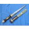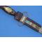 Poignard traditionnel réalisé par un artisan touareg et porteur de la grenade propre à la Légion étrangère. Longueur totale : 36,5 cm, longueur lame : 23 cm. cuir filali vert et brun, laiton, rehauts en argent massif. ciselures géométriques / ethniques. Commande locale pour un cadeau. Souvenir des OPEX au Sahel, Barkhane.