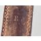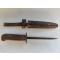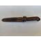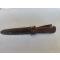 Poignard de tranchée, lame quadrangulaire, manche en bois strié, plaque de garde gravée CJ dans un ovale. Fourreau cuir, passant ceinture et fermeture cassés . Fourreau gravé RJ. Quelques tâches sur le manche. En l'état, récupération grenier. Longueur totale avec fourreau 28 cm. Lame 14,8 cm. Garde 5,4 cm X 3,4 cm.