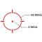 Réticule : 2 MOA dot, 65 MOA circle dot ou 65 MOA Circle (1 MOA = 3 cm à 100 mètres). Couleur du réticule : Rouge. Grossissement : x1. LED permettant 50 000 heures d'autonomie avec une pile CR2032. 12 niveaux d'intensité dont 2 compatibles pour les visions nocturnes. Point rouge équipé d'un panneau solaire. Technologie Shake Awake (S'éteint automatiquement au bout de 10, 60 ou 720 minutes et se rallume automatiquement à la détection de mouvement (Peut être désactivé). Réglage de la luminosité : Bouton +/-. Parallaxe : Sans. Fabriqué en aluminium. Graduation : 1 click = 1/2 MOA. Température de fonctionnement : -30°C à +60°C. Point rouge certifié IP67. Dimensions : L : 84mm, l : 46mm, H : 59mm. Poids : 140 g. Livré avec : 1 montage pour rail 21mm avec fixation QD, un outil de montage, une microfibre et une pile CR2032