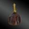 Corps en cuir épais, à deux passants sur le dos. Bec à cuillère doseuse et bouton poussoir de clapet fermeture.