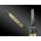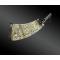 Corne gravée d’une scène de chasse au griffon par deux soldats en armes, de cercles au verso et de rubans sur les côtés.