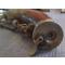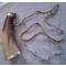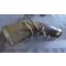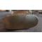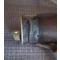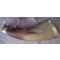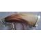 Poire à poudre noire, vide, en corne et laiton. Sans bec verseur. La corne était percée de trous de vrillettes et sont bouchés. La tôle de fond a été réparée récemment. La tête en laiton a été réparée quand la poche servait encore, c’est à dire environ 100 ans. La corde est d’origine. La corne est huilée à l’huile de lin