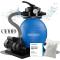 POMPE FILTRE À SABLE : Débit de filtration = 10.200 L/h // Classe de protection : IPX5 (protection contre les éclaboussures) // Puissance : 400 W // Grand volume du réservoir 25 L // Matériau : récipient et tuyaux en plastique robuste // Boîtier résistant aux intempéries : métal résistant et plastique ABS dur