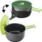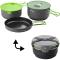 La poêle du set de cuisson Terra Camp 4 possède un corps en aluminium anodisé, un diamètre de 22 cm et un revêtement antiadhérent en céramique. Parmi les 2 casseroles du set Terra Camp 4, on a une grande casserole de 3,2 litres avec échangeur thermique et revêtement antiadhésif en PTFE et une casserole de taille moyenne de 2,3 litres avec également un revêtement antiadhésif en PTFE. Leur corps est en aluminium anodisé (matériau léger et résistant). La poêle et chaque casserole possèdent une poignée rabattable anti-brûlure. Rappel : on a également un couvercle avec fonction égouttoir (pour cuire plus rapidement et pour égoutter les pâtes ou le riz), un couvercle en silicone (pour mieux conserver les aliments en l'état) et une feutrine (pour protéger les casseroles entre-elles) ainsi qu'une housse de protection pouvant servir pour le transport (la popote reste parfaitement fermée et protégée contre les chocs) ou pour le repas (pour éviter de se brûler et pour maintenir les aliments au chaud). Grand avantage : le tout s'emboîte et se range ensemble et ne pèse que 1160 grammes : encombrement réduit et poids léger, idéal en bivouac, en camping et en voyage.