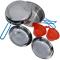 Les 7 ustensiles inclus avec cette popote CAO sont les suivants : 1 casserole en inox de type faitout (capacité : 1,5 litre), 1 poêle en inox (pouvant également faire office de couvercle pour réchauffer plus rapidement vos plats ou pour maintenir au chaud) ainsi que 2 assiettes en inox et 2 tasses rouges en plastique (certifié sans BPA). L'ensemble a un poids tout à fait honnête (630 grammes) et un volume de rangement tout à fait satisfaisant (19 cm de diamètre et 9,5 cm de hauteur) pour de la grande randonnée, du bivouac ou du camping. Par conséquent, on peut parler sans demi-mesure de popote de randonnée et de popote de camping.