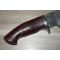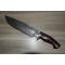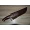 Très gros couteau de camp, fixe réalisé par Mickaël Moing, un de ses premiers couteaux dans cette gamme. La lame est forgée à partir d'une lame d'acier à ressort, surement de camion, habituellement acier 100CR6 forgé avec trempe sélective, semi-brut de forge et patinée (acide) fait 26,5cm de long et épaisseur 8mm. Le manche est en bois de fer stabilisé et teinté, montage sur soie, collée et rivetée, avec rivet mosaïque et demi-garde avec intercalaires. L'étui de ceinture est en cuir épais, avec gousset et passant amovible, pour un port pratique lors de l'assise par exemple.