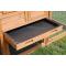 Ce poulailler avec enclos comprend un enclos grillagé avec porte d'accès principale (largeur 57.5 cm x hauteur 83 cm) et petite porte d'accès sous abri, un abri couvert et fermé en hauteur avec une porte d'accès en façade pour le nettoyage de l'abri (largeur 26.5 cm x hauteur 39 cm) et fenêtre plexiglass de visualisation
