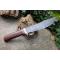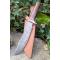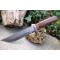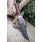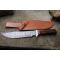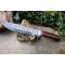 Longueur du manche 12cm - Longueur de la lame 20cm - Tranchant de 17cm - Lame en Acier damas 256 couches - Lame de type harpoon - Garde en nickel - Manche en bois - Fabrication Artisanale - Les dessins de la lame sont uniques comme une empreinte - Etui cuir