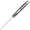 Longueur fermé 10.80cm. Longueur de lame 8.26cm. Lame en acier D2 59-61HRC finition satin. Plaquettes du manche en black/Green G10. Ouverture d'une main avec le flipper. Logo incrusté dans le manche. Trou dans le manche pour dragonne. Etui cuir noir.